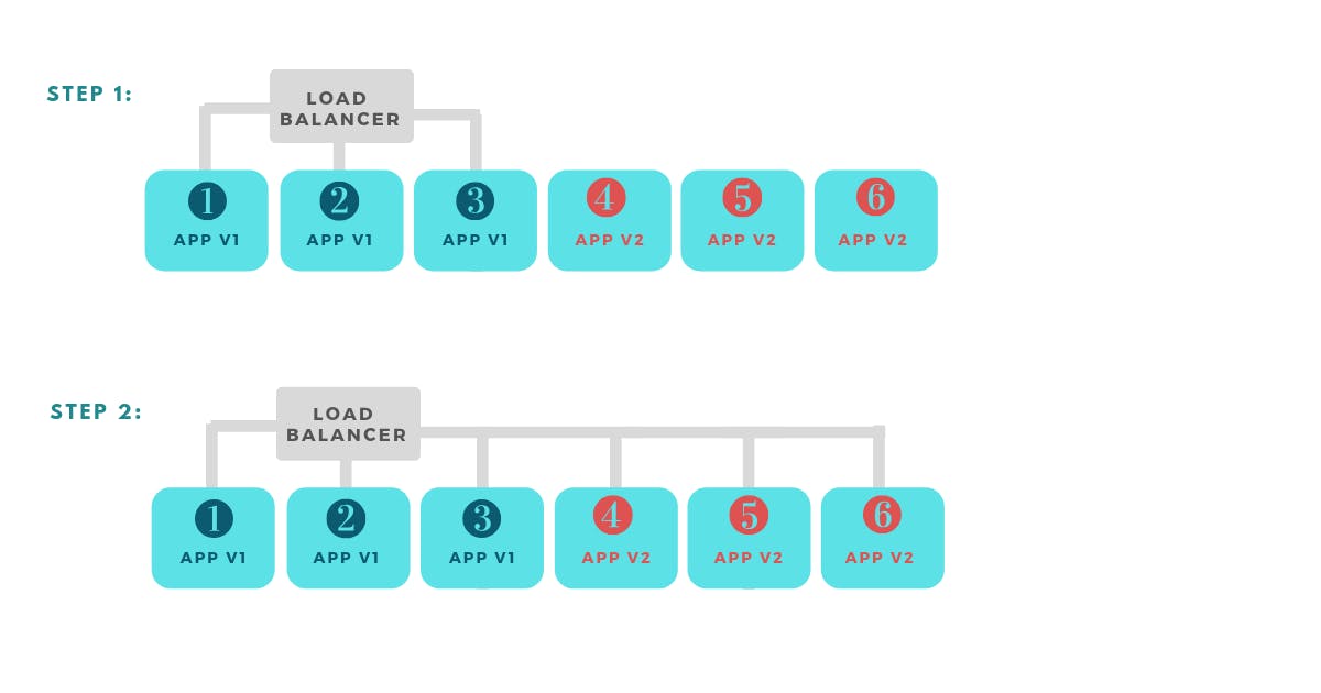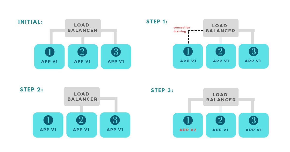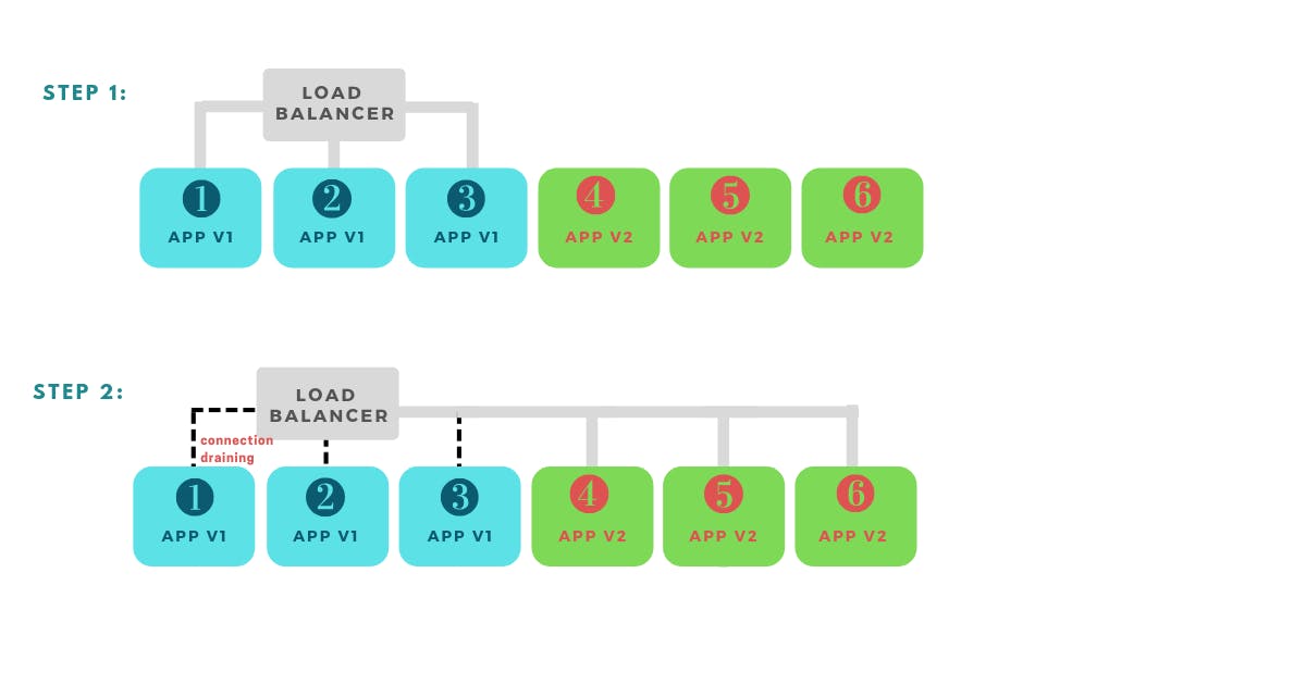 The method implies creating a group of new instances running version 2 of the app. In the second step, the load balancer starts sending requests only to the new pool of instances while still receiving requests that were already in progress on the old instances (connection draining). The user can also choose not to run connection draining.