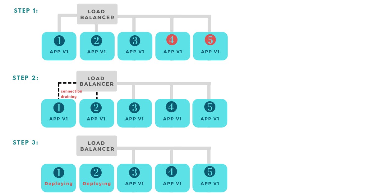 In step 1, two additional instances running old app version are added to the Load Balancer. Then, two instances at a time start connection draining, followed by deployment.