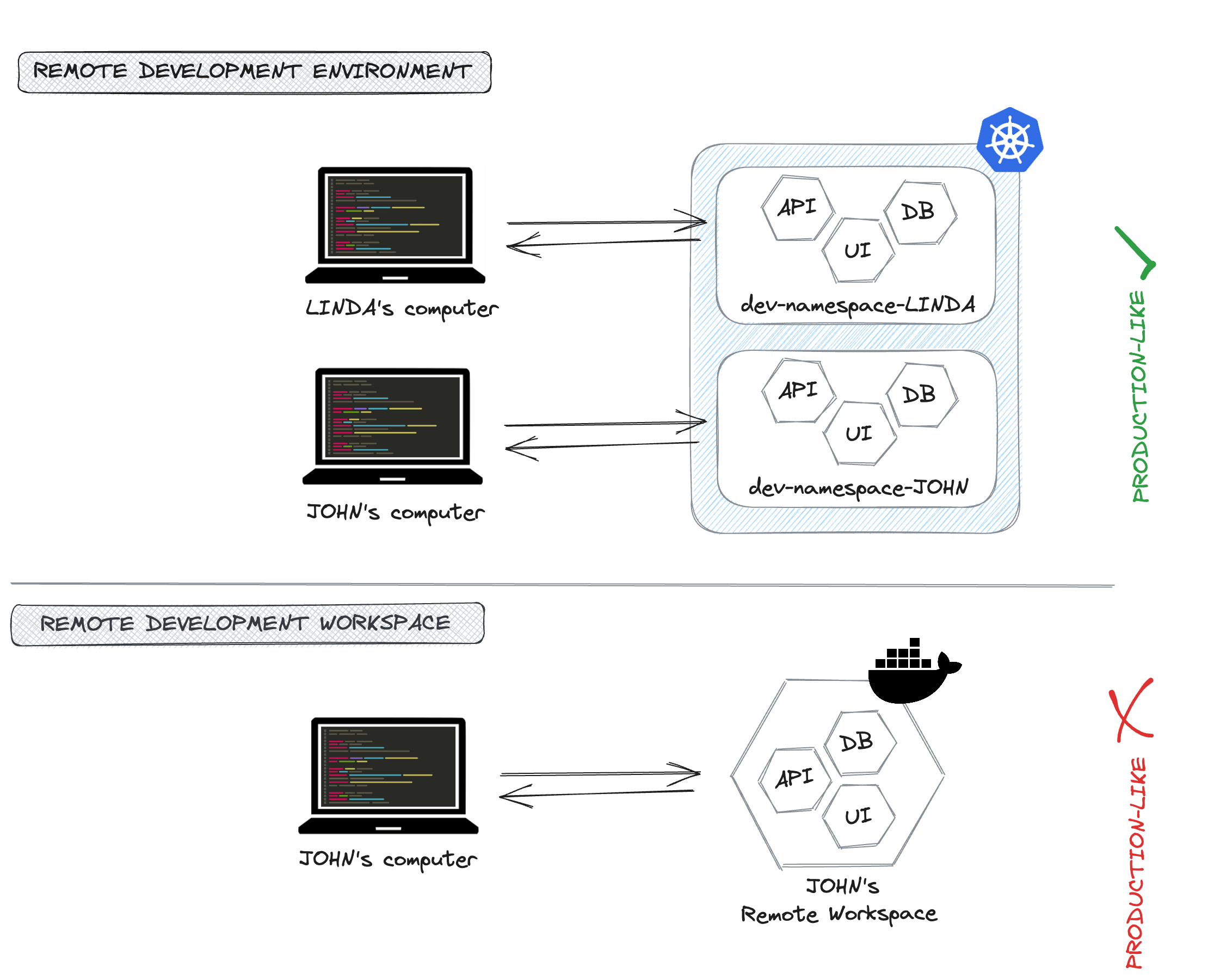 The major difference between remote development environments and remote workspaces is the fact that one resembles the production environment, while the other simply moves the development runtime from your local laptop to a remote instance.