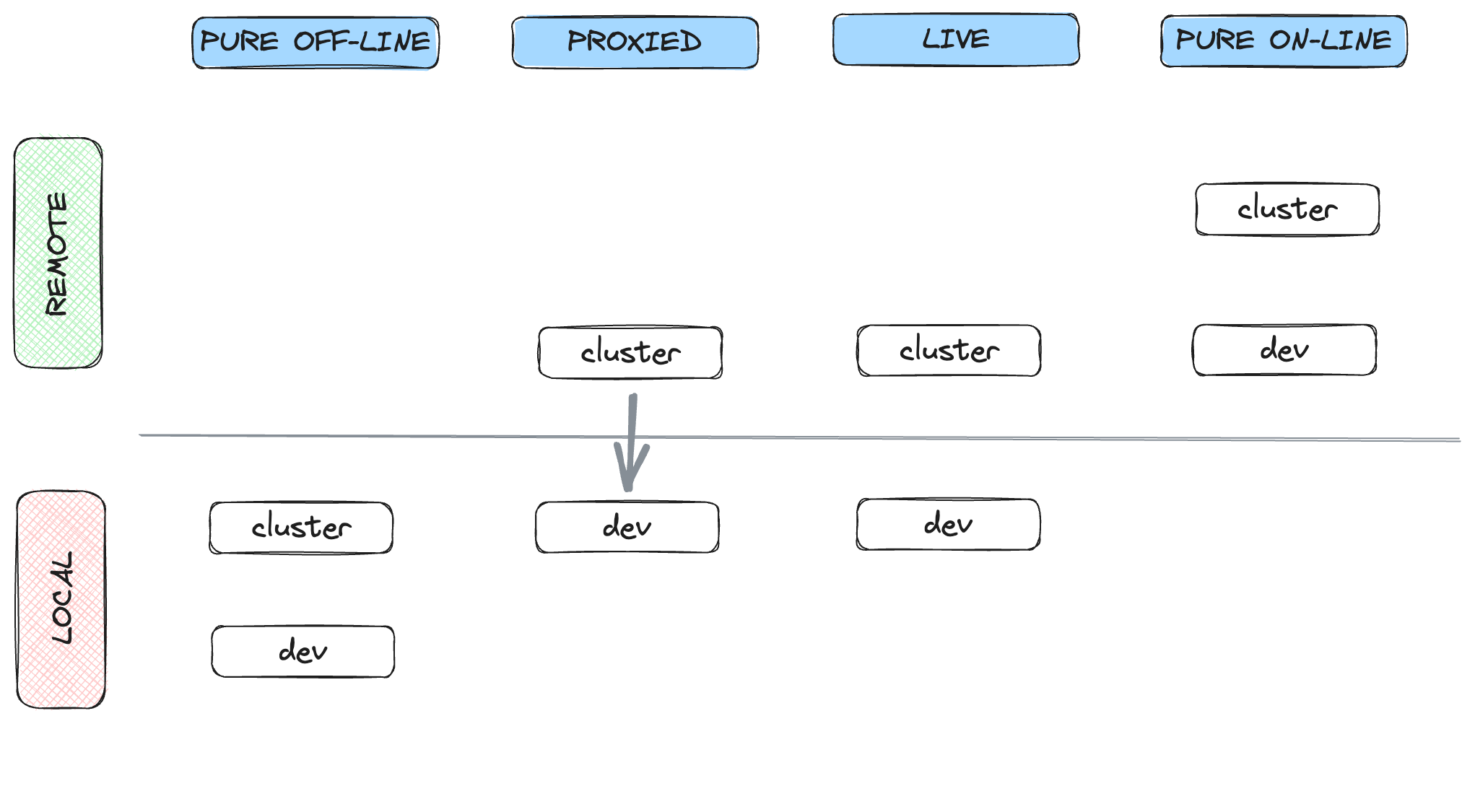 If you're new to Kubernetes, it's important to understand that each setup option has its own strengths and weaknesses. The best option for you will depend on your specific needs and circumstances. For example, if you're working on a small project or just getting started with Kubernetes, a pure off-line setup might be the best option. But if you're working on a larger project or need to collaborate with a team, a proxied or live setup might be more suitable.