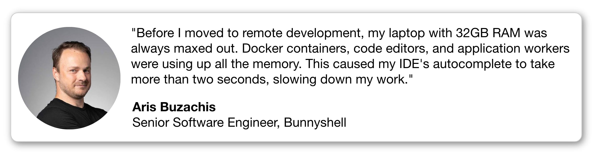 For Aris, one of the main benefits of remote development was improved resource efficiency. In a remote development setup, the development environment is hosted on a remote Kubernetes cluster, isolated by a namespace, rather than the local machine. This means that the resource consumption is offloaded to the cloud servers, freeing up the majority of his local machine's resources.