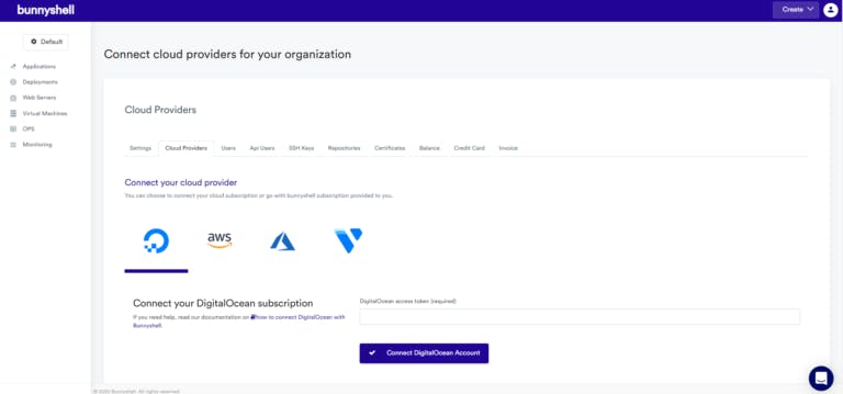 Bunnyshell currently offers integrations with Amazon Web Services, Microsoft Azure, DigitalOcean and Vultr. All you have to do is connect your account/s from the Settings section through this simple process:
