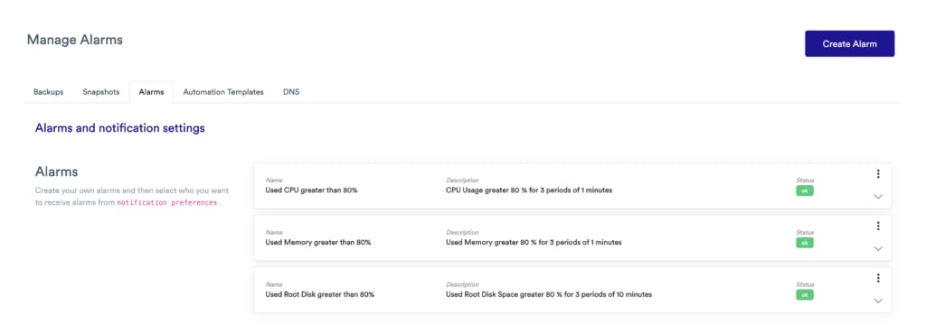 Along with the automated alerts that are sent when something that requires manual input happens, you can also set specific alerts from the OPS -> Alarms section, for various cases such as MySQL queries, Network Inbound Bandwith, Storage, Memcached Available Cache Size, and many more which you can see for yourself!