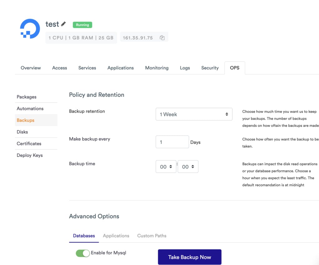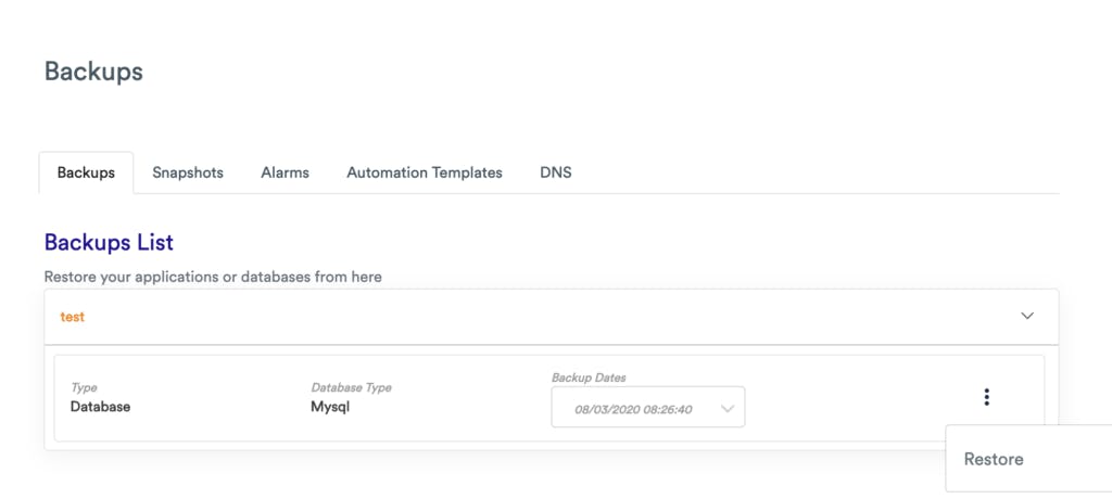 Backups can be found in the OPS section under the Backups tab. Restoring a database backup is as easy as pressing a button – no more manual connections to the server and doing the restore operations by hand.