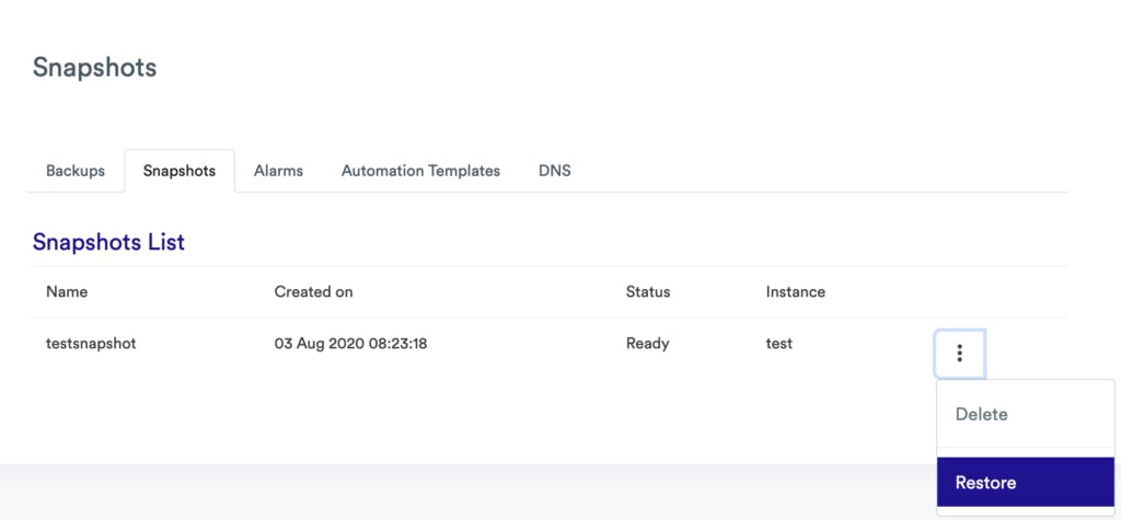 You can use snapshots to restore a previous state of your virtual machine by creating a new one from the actions menu in the virtual machine/webserver view, to replace the one that has been corrupted/polluted or has become undesirable.