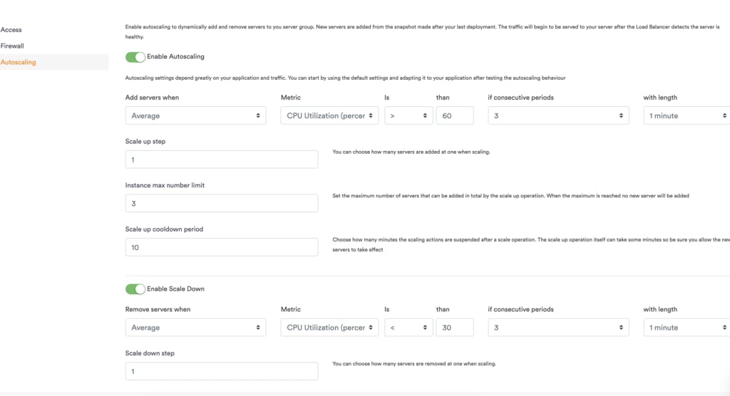 In addition to horizontal scaling, in Bunnyshell you also have the option of auto-scaling up and down based on some options that you can set, for example, CPU utilization, based on which you can decide to scale down to 1 instance for low usages and scale up to 12 instances – for example if you have a usage spike – and then scale down after the spike passes.