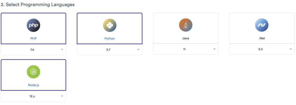 Then you can select one or more programming languages that will be installed on the machine in the setup process, which will remove the DevOps time needed to complete this process.