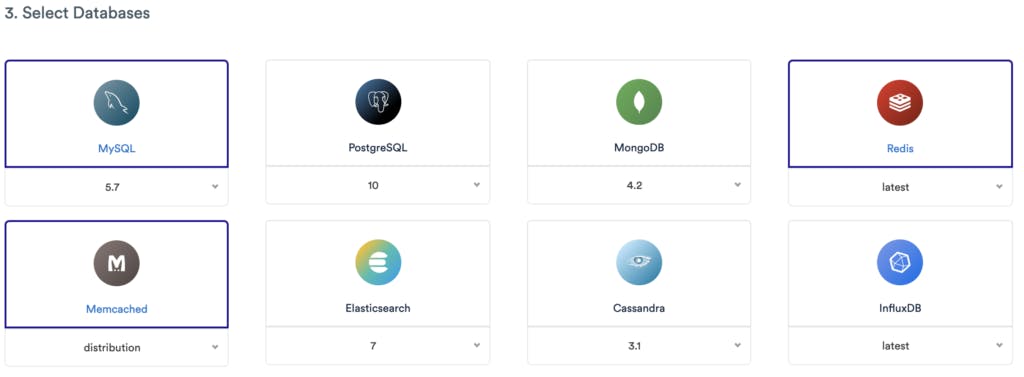 After selecting your programming languages, you can also select one or more database/caching services that will be installed and configured during the setup process. This removes even more DevOps time from your cloud management processes.