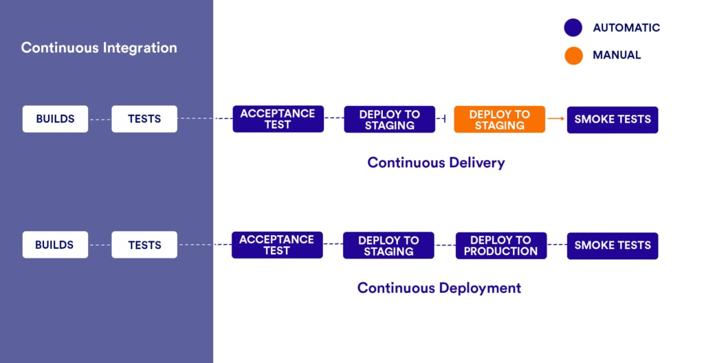 With continuous delivery, the process allows developers to be more productive by deploying a new release at any time with a few clicks. On the other hand, continuous deployment is a step up from continuous delivery as every change in the source code is deployed to production automatically. This deployment does not require approval from a developer.