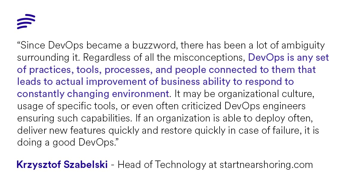 “Since DevOps became a buzzword, there has been a lot of ambiguity surrounding it. Regardless of all the misconceptions, DevOps is any set of practices, tools, processes, and people connected to them that leads to the actual improvement of business ability to respond to constantly changing environment. It may be organizational culture, usage of specific tools, or even often criticized DevOps engineers ensuring such capabilities. If an organization is able to deploy often, deliver new features quickly and restore quickly in case of failure, it is doing a good DevOps”
