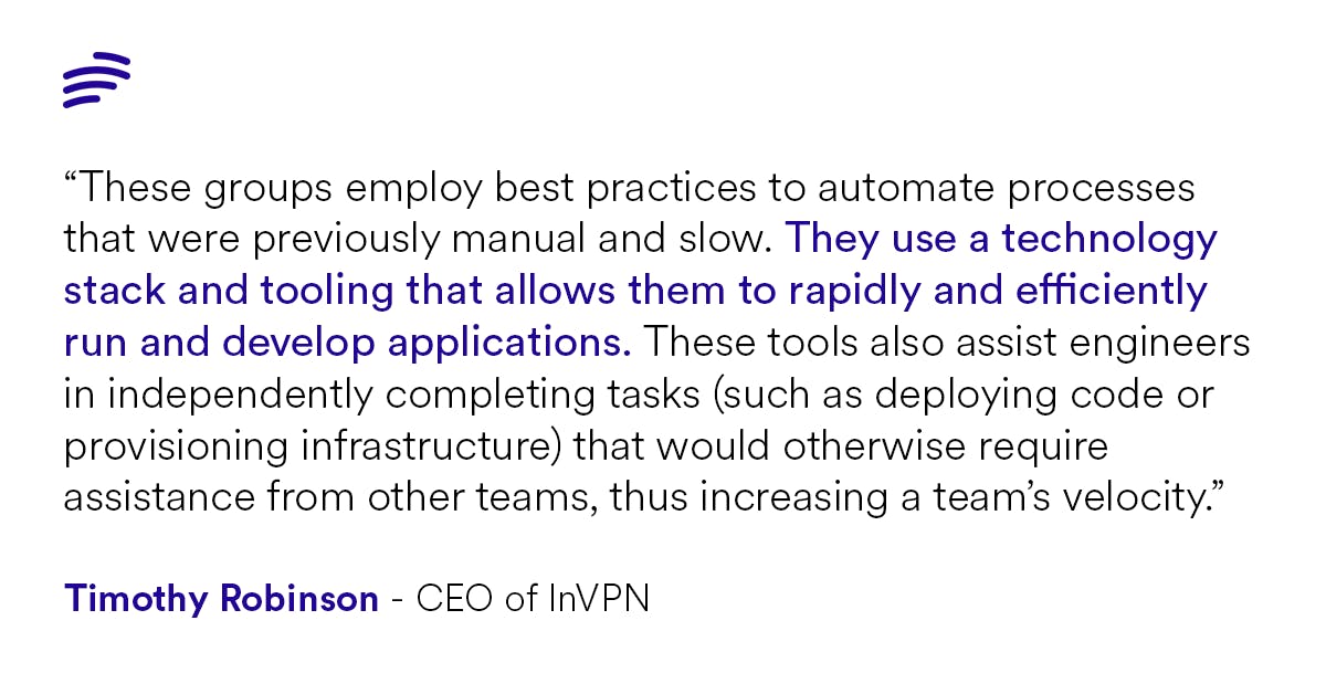 “These groups employ best practices to automate processes that were previously manual and slow. They use a technology stack and tooling that allows them to rapidly and efficiently run and develop applications. These tools also assist engineers in independently completing tasks (such as deploying code or provisioning infrastructure) that would otherwise require assistance from other teams, thus increasing a team’s velocity”