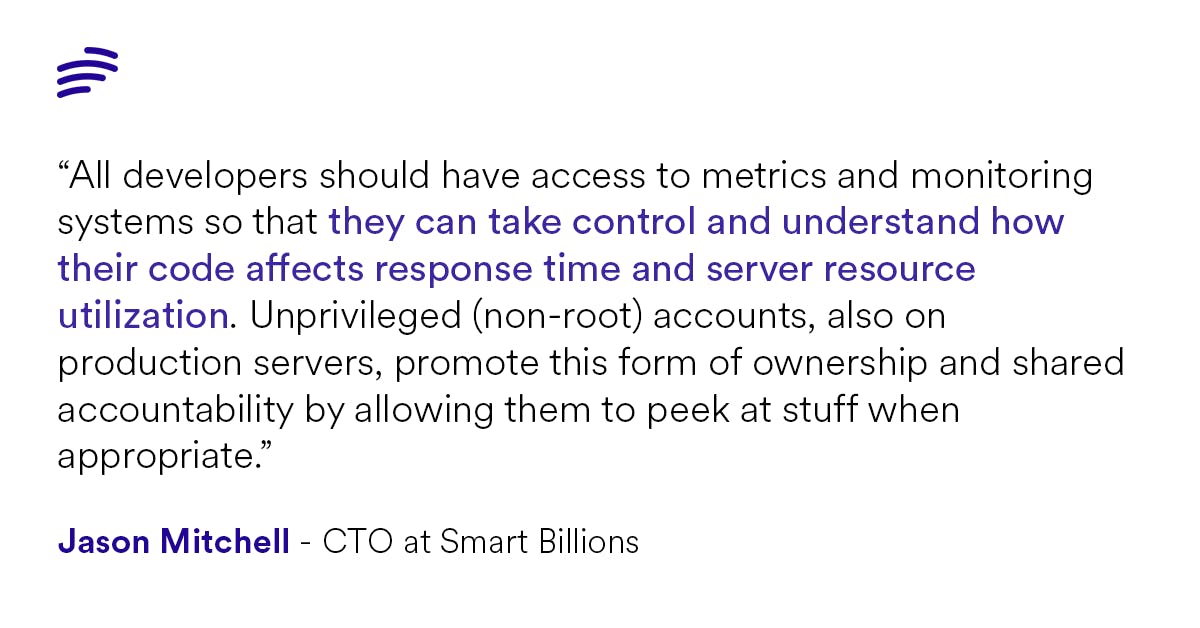 “All developers should have access to metrics and monitoring systems so that they can take control and understand how their code affects response time and server resource utilization. Unprivileged (non-root) accounts, also on production servers, promote this form of ownership and shared accountability by allowing them to peek at stuff when appropriate”