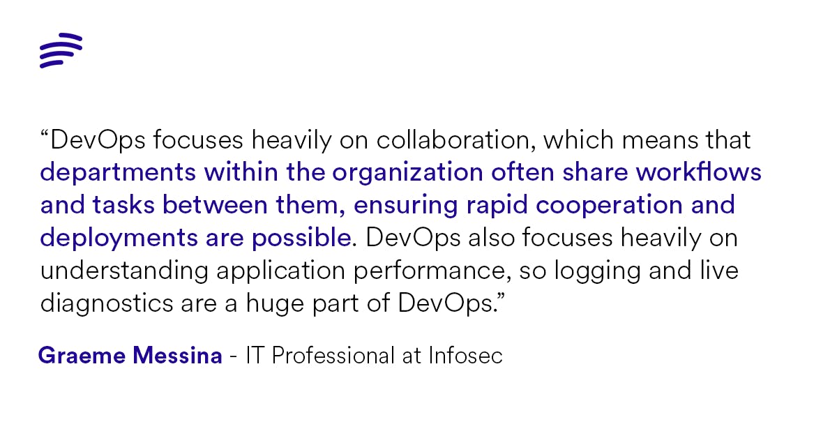 “DevOps focuses heavily on collaboration, which means that departments within the organization often share workflows and tasks between them, ensuring rapid cooperation and deployments are possible. DevOps also focuses heavily on understanding application performance, so logging and live diagnostics are a huge part of DevOps”– Graeme Messina, IT Professional at Infosec.